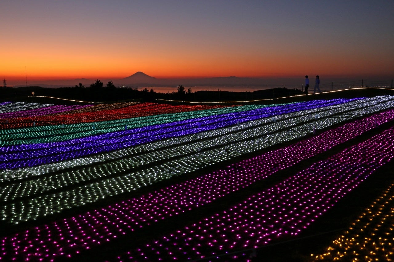 標高約300mに位置する「マザー牧場 山の上エリア」の立地を生かし、富士山のシルエットが浮かぶ夕景や、東京湾越しの東京や横浜の夜景などの景色と、色鮮やかに光り輝く約60万球のイルミネーションの共演をお楽しみいただけます♪