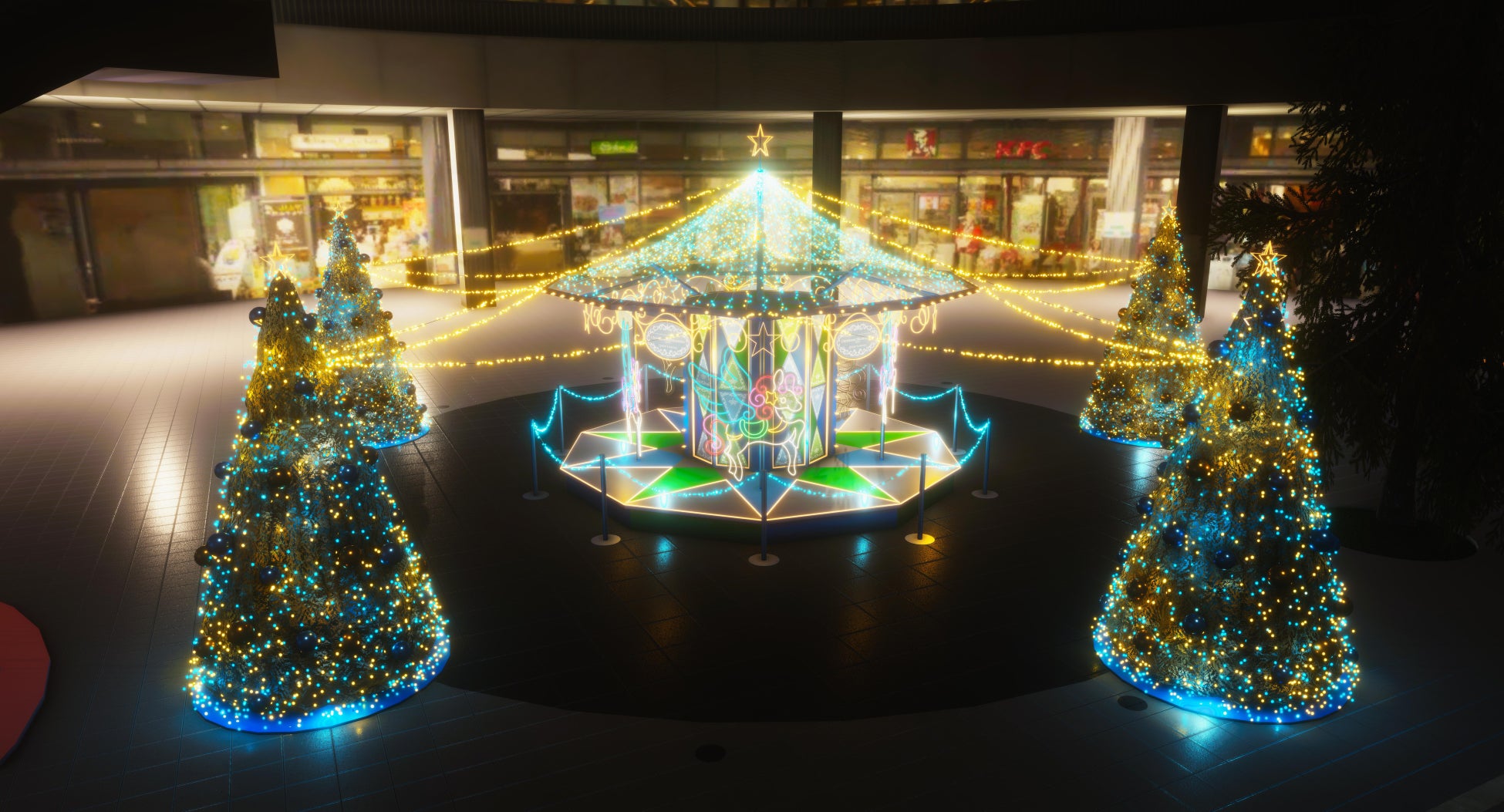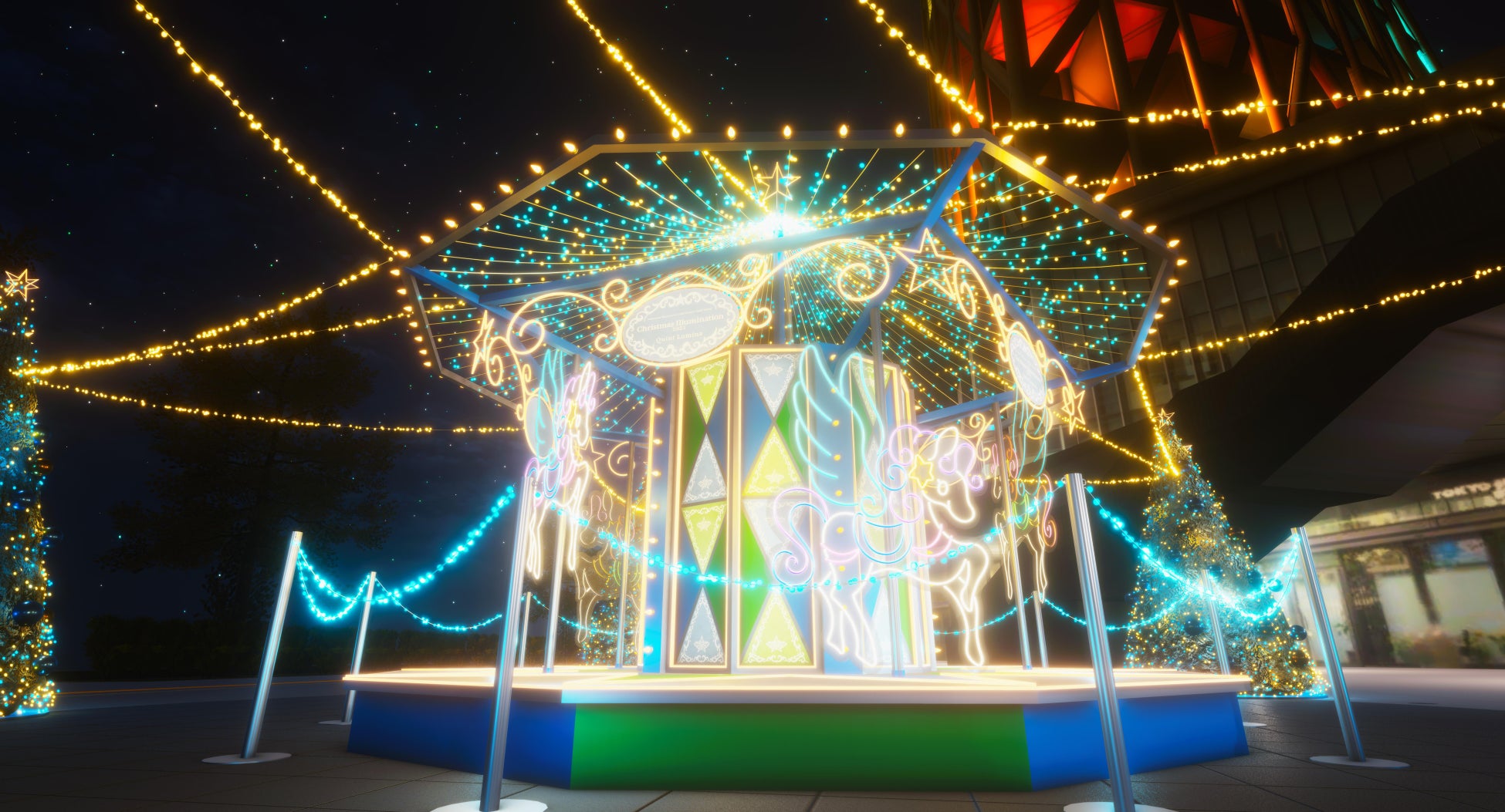 2023年のメインテーマは「Quint Lumina(クィントルミナ)」空と星と光をモチーフにした本イルミネーションは、上空から見ると5つ(Quint)のクリスマスツリーの光(Lumina)が星をかたどっているように見えます!最新のLEDライトで装飾された5本のクリスマスツリー、5頭のペガサスが彩られた大型メリーゴーランドが東京スカイツリーと共演し、光りかがやく幻想世界を演出します。
