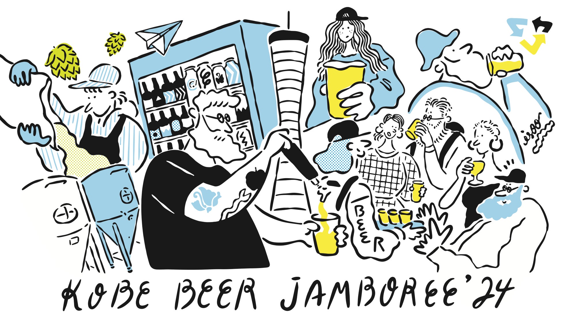 中央には神戸をイメージしたモチーフや、当イベントの主役でもある「売り手」が描かれています。左右にはそれぞれ「造り手」と「飲み手」をデザインすることで、ビールに関わる人々を表現しています。