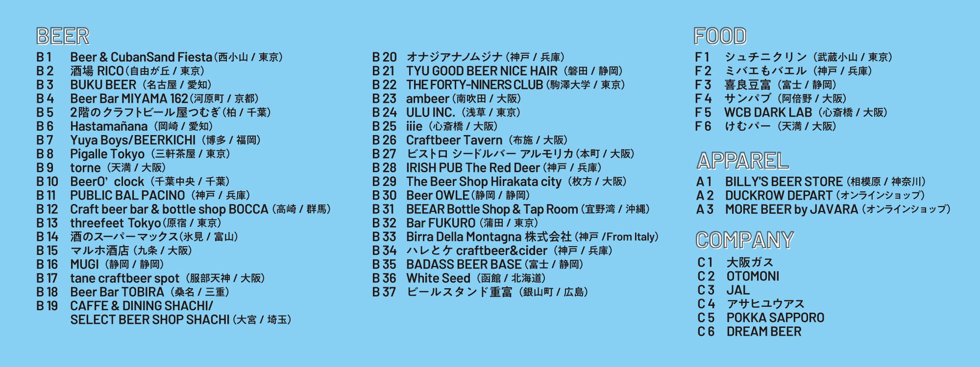 北は北海道、南は沖縄まで、全国から52社/店舗が集まりました。ビール出店37区画、フード出店6区画、アパレル出店3区画、企業出店6区画を予定しております。